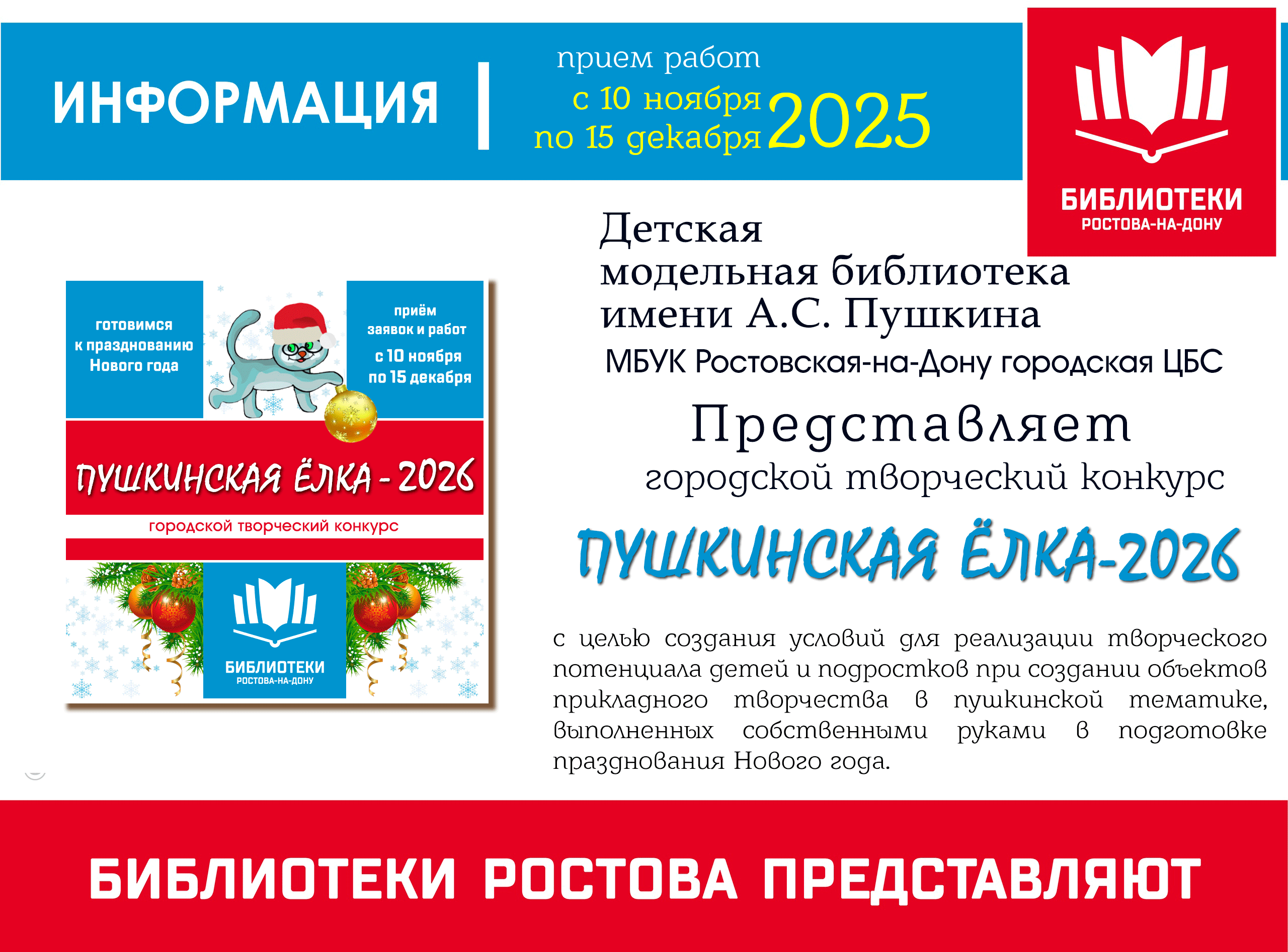 Модельная детская библиотека имени А. С. Пушкина приглашает принять участие в городском творческом конкурсе «Пушкинская ёлка-2026». Прием заявок и работ от участников с 10 ноября по 15 декабря 2025 года включительно. Все участники конкурса делятся на две возрастные группы: Первая группа — дети до 7 лет включительно; Вторая группа — дети от 8 до 14 лет включительно. Помощь родителей в любой возрастной группе приветствуется. К участию в конкурсе принимаются работы, соответствующие тематике конкурса ...