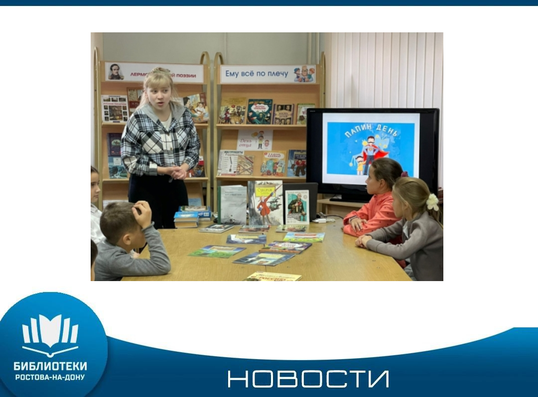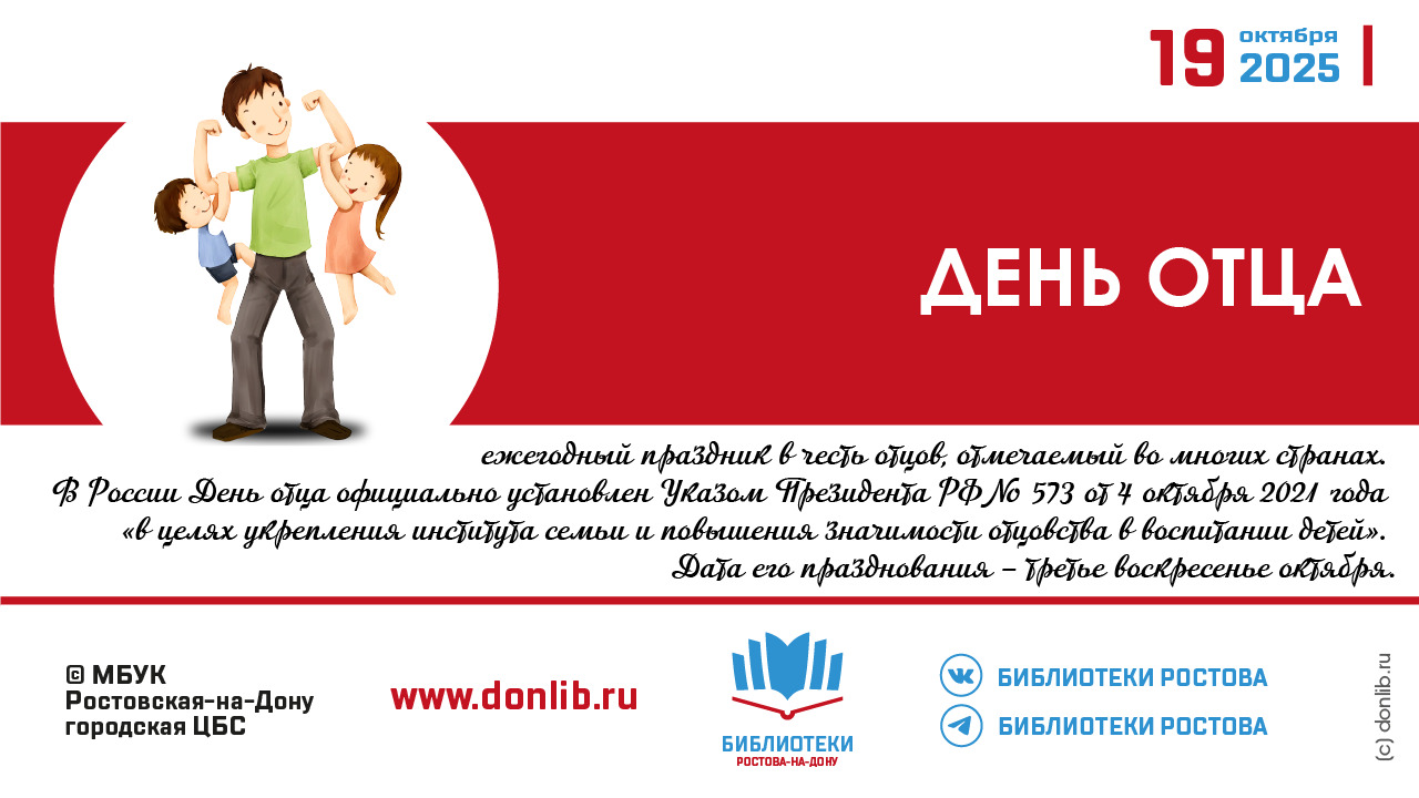 19 октября — дата празднования Дня отца в России в 2025 году. К праздничной дате в библиотеках Ростова проходят мероприятия. Накануне Дня отца в России, специалистом детской библиотеки имени Ильича, был проведен праздник «Папин день календаря». В России День отца отмечают в третье воскресенье октября — соответствующий указ подписал президент России в 2021 году. Участники праздника из вступительной беседы узнали об истории Дня пап, а слайдовая презентация дополняла рассказ о традиции почитания родителей ...