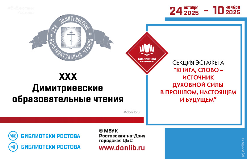 В Ростовской области пройдут 30–е Димитриевские образовательные чтения, которые традиционно станут важной площадкой для обсуждения самого широкого круга вопросов. Тема чтений 2025 года— «Просвещение и нравственность: формирование личности и вызовы времени». Ростовская–на–Дону городская Централизованная библиотечная система в рамках 30–х Дмитриевских образовательных чтений проводит секцию–эстафету «Книга, слово – источник духовной силы в прошлом, настоящем и будущем». Председатель секции: Сергей Манукович ...