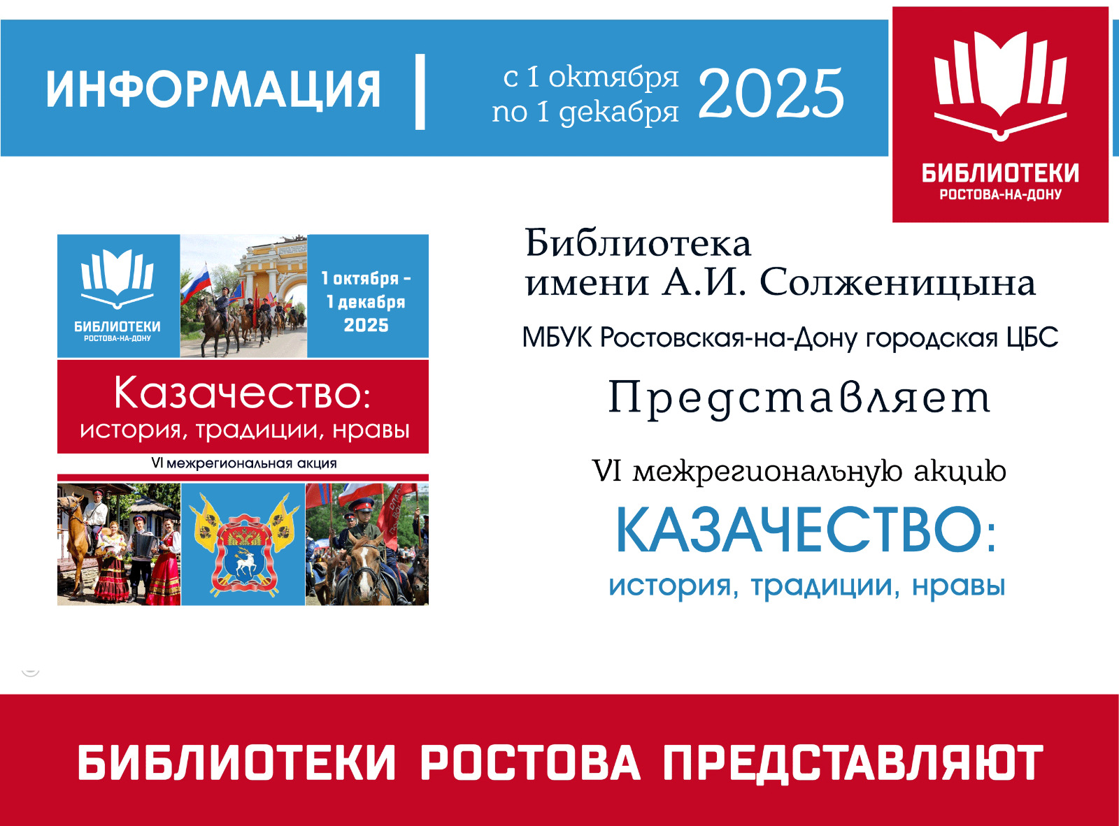 Библиотека имени А.И. Солженицына приглашает принять участие в VI межрегиональной акции «Казачество: история, традиции, нравы». Акция проводится с 1 октября по 1 декабря 2025 года. Участник акции размещает творческие работы в сообществе «Казачество: история, традиции, нравы» в социальной сети «ВКонтакте», используя хэштег #Казачество_история_традиции_нравы соответствующие любой из предложенных номинаций: - «Традиционная и современная культура казачества в литературе, живописи, музыке» – книжно-иллюстративная ...