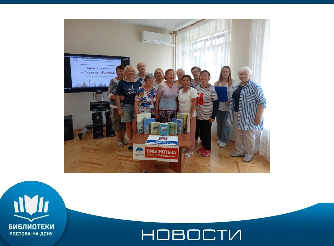 В преддверии празднования Дня города специалисты Библиотеки имени А. Серафимовича провели Краеведческий час «По улицам Ростова» для посетителей отделения дневного пребывания МБУ «Центра социального обслуживания населения Первомайского района города Ростова-на-Дону». Для участников была подготовлена – виртуальная экскурсия по центру города, по улице Большой Садовой. Присутствующие познакомились с архитектурной историей города, узнали о том, какие интересные дома и постройки были здесь возведены, кому ...