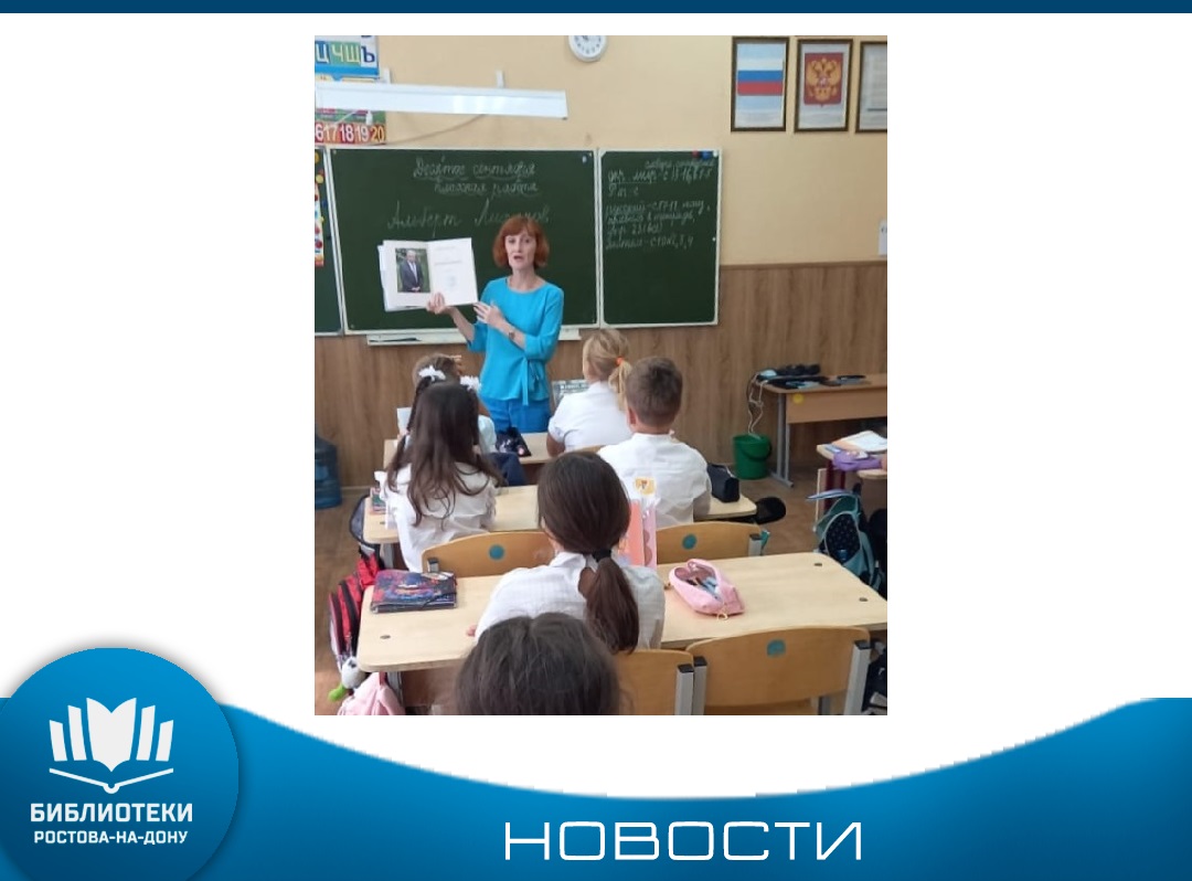 Специалист детской библиотеки имени Зои Космодемьянской подготовила и провела час писателя «Сострадание как талант…» к 90-летию со дня рождения А.А. Лиханова. Библиотекарь познакомила учащихся 3 «В» МБОУ «Школа № 67» с жизнью и творчеством замечательного русского писателя Альберта Анатольевича Лиханова. С его не простой, но интересной судьбой. Альберт Лиханов принадлежит к тем писателям старшего поколения, чьи книги, написанные для читателей минувшей советской эпохи, кажутся обращенными и к нам. ...