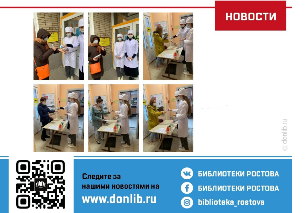 6 апреля в библиотеке им. Н.М. Карамзина МБУК Ростовская-на-Дону городская ЦБС прошла акция «Безопасная библиотека». Активное участие в акции принимали волонтеры – студенты РостГМУ. Волонтеры проводили всем посетителям библиотеки термометрию и рассказывали о том, что такое коронавирус, об основных симптомах болезни и отдаленных последствиях, а также о необходимости профилактических мер. Маска, перчатки и социальная дистанция – это то, что реально может уберечь каждого из нас. Кроме того, они познакомили ...
