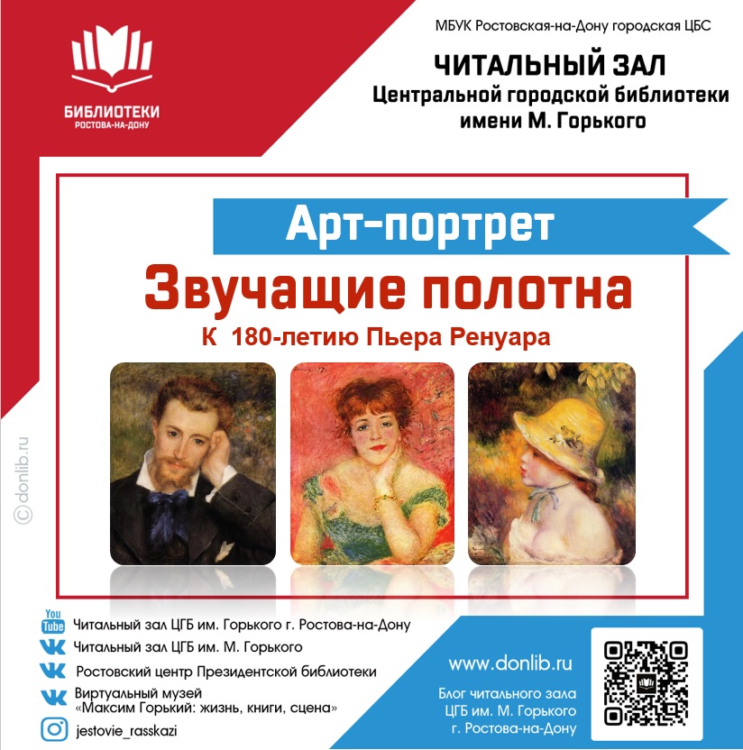 17 февраля в Центре социального обслуживания населения Ленинского района Ростова сотрудники читального зала Центральной городской библиотеки им. М. Горького МБУК Ростовская-на-Дону городская ЦБС провели заседание клуба «От сердца к сердцу». Офлайн-встреча членов клуба была посвящена 180-летию со дня рождения Пьера Огюста Ренуара - французского живописца, графика, скульптора и одного из основных представителей импрессионизма. Сотрудники читального зала рассказали подопечным ЦСОН Ленинского района ...