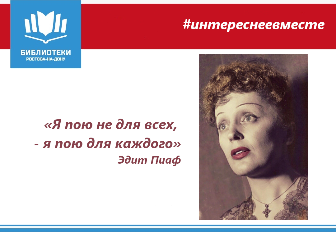 «Я пою не для всех, - я пою для каждого». В 2020 году исполнилось 105 лет со дня рождения певицы Эдит Пиаф - знаменитого французского «воробушка». Если вам захочется в очередной раз посетовать на тяжёлую судьбу, то просто вспомните эту маленькую хрупкую женщину и всё, через что ей пришлось пройти. Она много пережила трагедий, но не сломалась и до последнего дня своей короткой, но до предела насыщенной жизни являлась примером сильного и чистого духом человека. К юбилею французской артистки отдел ...