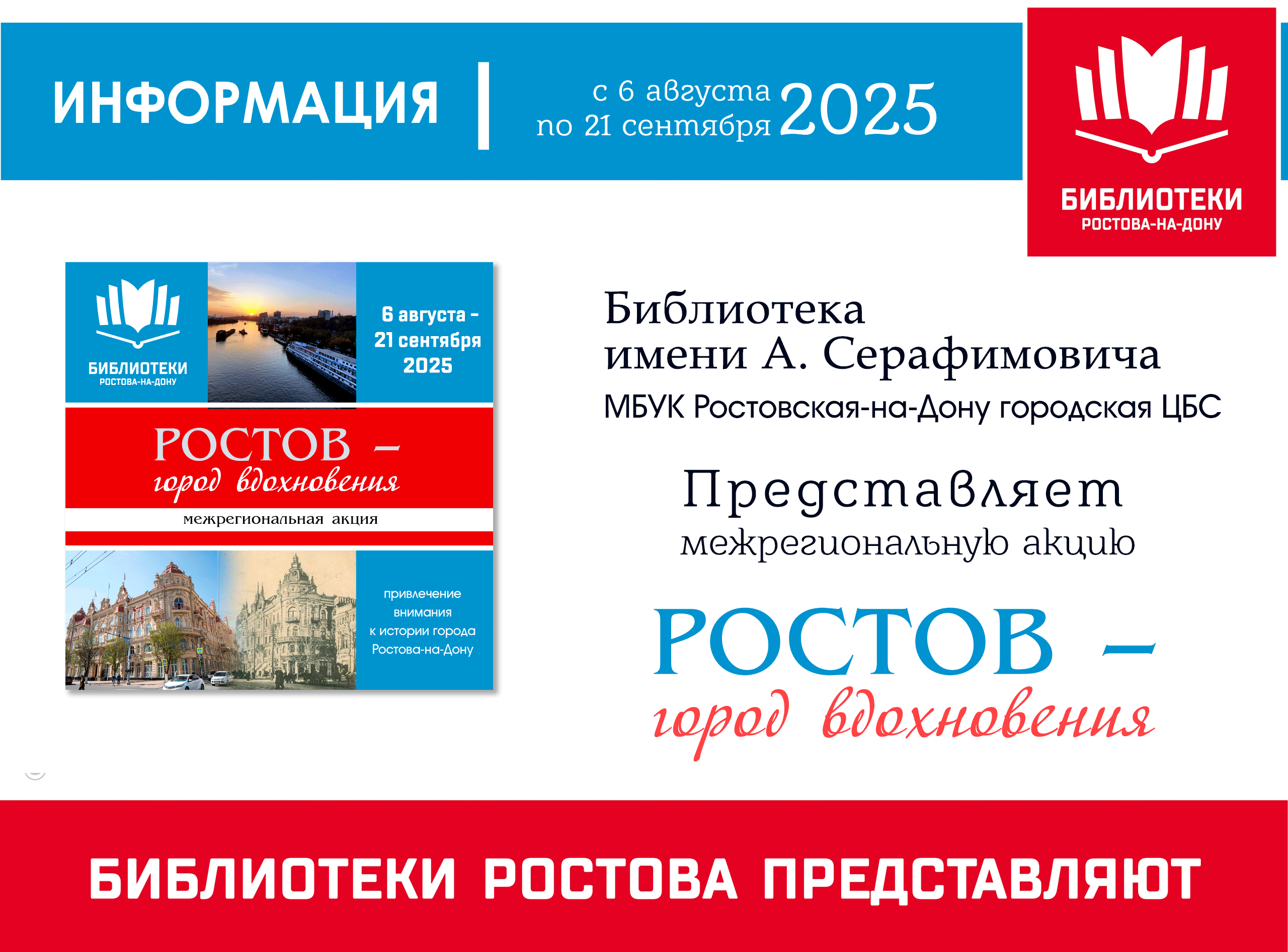 Библиотека имени А. Серафимовича приглашает принять участие в межрегиональной акции «Ростов — город вдохновения». Акция проводится с 6 августа 2025 года по 21 сентября 2025 года. Участники акции должны в сообществе социальной сети ВКонтакте «Ростов - город вдохновения» разместить краткий отчет о проделанной работе: - пост с фотографией и описанием любимого места в городе; - видеоролик на тему «Ростов-на-Дону — мой любимый город»; - творческая работа (рисунок, коллаж, плакат, стихотворение и др.) ...