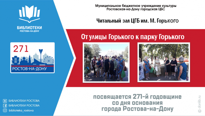 Ко Дню города Ростова-на-Дону в рамках программы «Библиоопека» и проекта «Максим Горький и Ростов-на-Дону, сотрудники читального зала Центральной городской библиотеки имени М. Горького провели пешеходную экскурсию с прихожанами храма иконы Божией Матери «Державная» г. Ростова-на-Дону и подопечными Ростовского регионального отделения Всероссийского общества глухих. Во время пешего похода к парку сотрудники читального зала знакомили инвалидов по слуху с историческим центром Ростова, напомнив о том, ...