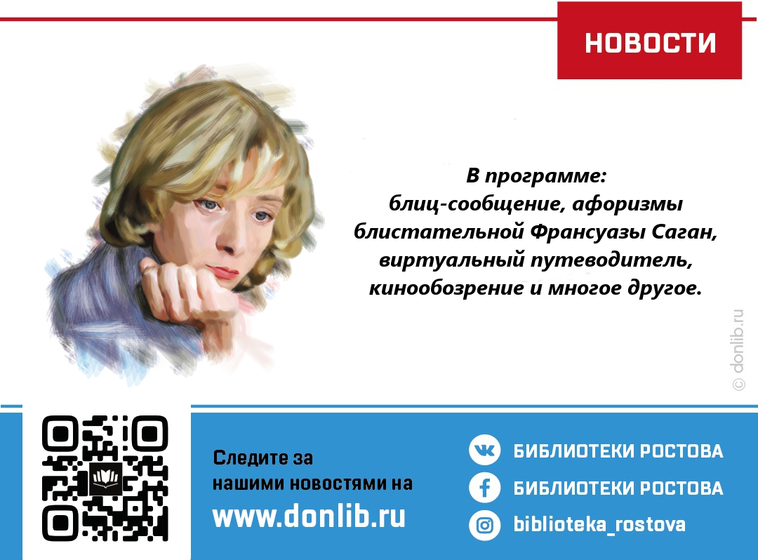 Уважаемые читатели! Абонемент художественного сектора ЦГБ имени М. Горького приглашает вас посетить виртуальную литературную гостиную «Мир Франсуазы Саган», посвящённую 85-летнему юбилею со дня рождения культовой французской писательницы. Вы сможете узнать интересные факты из жизни этой яркой женщины, ближе познакомиться с её творчеством, которое в своё время произвело настоящий фурор в литературном мире и остаётся актуальным по сей день, а также открыть для себя калейдоскоп блистательных цитат автора. А ...